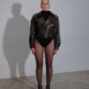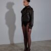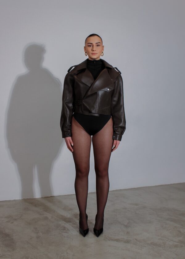 Skórzana ramoneska o wyjątkowym kroju oversize. Kurtka podczas noszenia rozpiętej tworzy efekt loose fit, który po zapięciu na wygodną klamrę idealnie dopasowuje się do sylwetki dzięki ściągnięciu i podwinięciu skóry naturalnej. Dzięki neoprenowej bazie kurtka z delikatnej, jagnięcej skóry naturalnej nabiera cięższego efektu z wykończeniem rough edge, zachowując przy tym swoją lekkość i wygodę. Podszewka z przodu wykończona jest drugą warstwą skóry naturalnej.